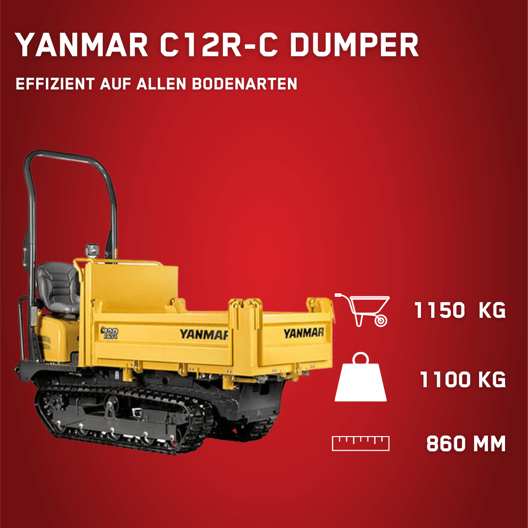 Ein weiteres Mitglied unserer Dumper- Familie ist der Yanmar C12R-C . Er gehört zu den Raupendumpern, die kompakt sind und trotz alldem eine effiziente Arbeit leisten. Mit einer Nutzlast von 1150 kg übersteigt er damit sein Eigengewicht, damit ist es also ein echtes Kraftpaket . Mit einer Länge von nur 2.650 mm und einem kleinen Wendekreis von 1.810 mm lässt er sich darüber hinaus hervorragend manövrieren. Auch für Sicherheit ist ausreichend gesorgt durch einen Bügel an der Mulde, ein Sicherheitsgurt. Der Rückfahralarm schützt den Bediener; der Kipphebel wird während der Fahrt verriegelt.