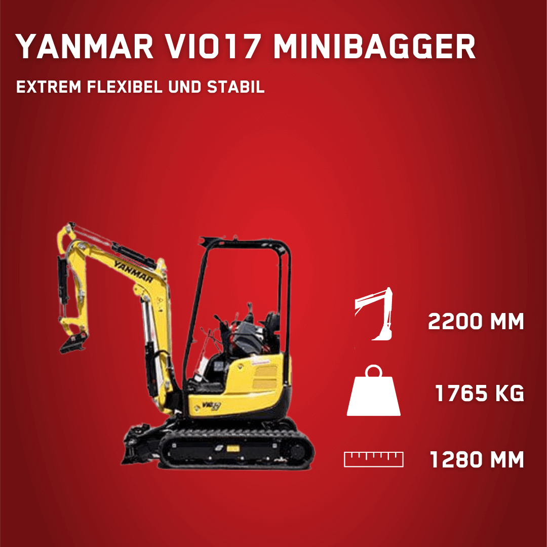 Der Yanmar Vio17 zählt zu den beliebtesten Maschinen in unserem Sortiment. Er ist kompakt, variabel und extrem stabil. Er kann nämlich sowohl zum größten als auch zum kleinsten Bagger seiner Kategorie gemacht werden, denn das Fahrwerk kann in der Breite zwischen 950mm-1280mm beliebig eingestellt werden. Kraftstoffeffizient und leise: Das ist der Motor unseres leistungsstarken Baggers! Besonders beeindruckend ist aber die Hubkapazität und seine Kipphöhe. Selbst in engen Baustellen performt der Vio17 herausragend.