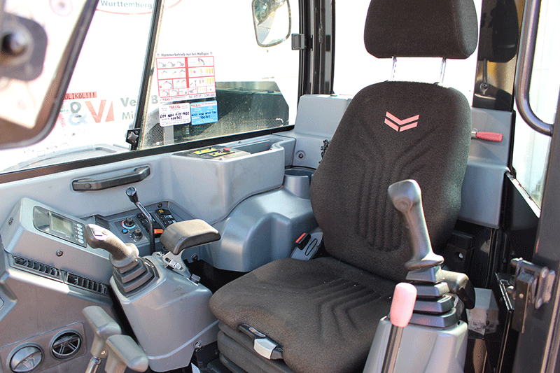 Auch der Komfort kommt bei unserem Yanmar SV100-2PB nicht zu kurz. Bereits die große Tür der Fahrerkabine erleichtert das Ein- und Aussteigen erheblich. Im großzügig ausgestalteten Innenraum haben erwartet Sie anschließend viel Platz und eine große Beinfreiheit, was sich besonders an langen und harten Arbeitstagen positiv bemerkbar machen wird. Dank der ergonomisch angeordneten Steuerhebel haben Sie zudem jederzeit eine optimale Bewegungspräzision. Zusätzlich lassen sich der breite luftgefederte Sitz mit integrierter Kopfstütze von Ihnen auf die optimale Arbeitsposition einstellen. Auch unerwünschte Geräusche und Vibrationen werden so stark abgeschottet, dass sie innerhalb der Fahrerkabine sehr viel geringer wahrgenommen werden und so nicht weiter stören.